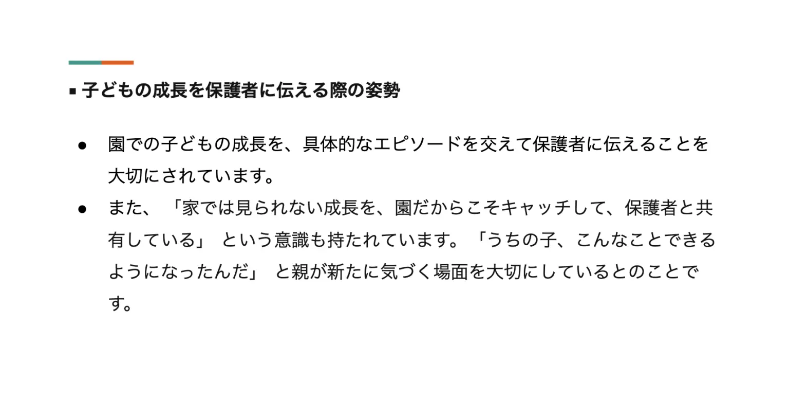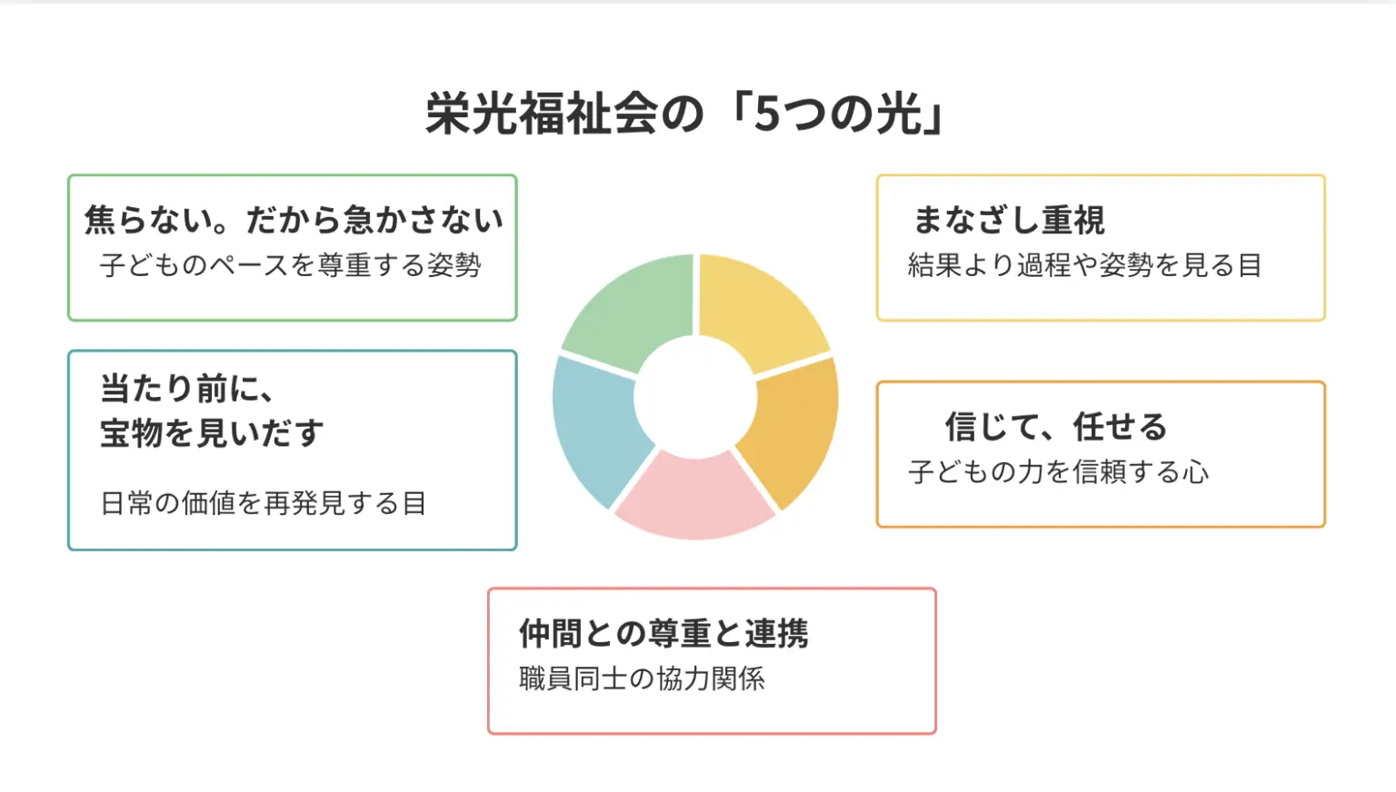 プロジェクトでは、先行園が“主体性を育む保育”の中で、 同法人の理念をどう体現しているかを丁寧に言語化しました。