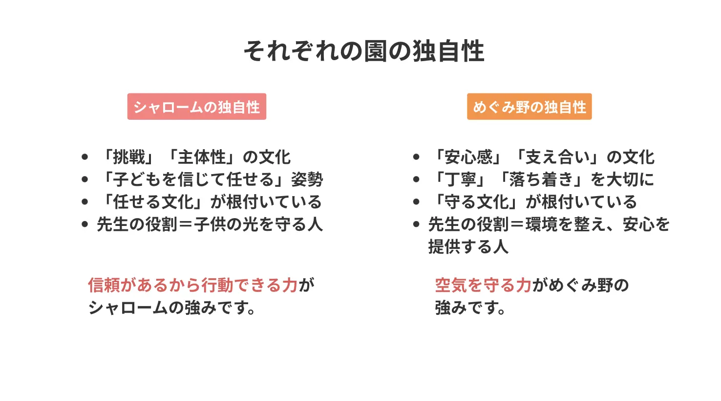 その共有をきっかけに、姉妹園の職員のあいだに「自分たちもこの価値を発揮したい」という思いが芽ばえ、園長もまた、大きな決断に向けて動きだしたそうです。