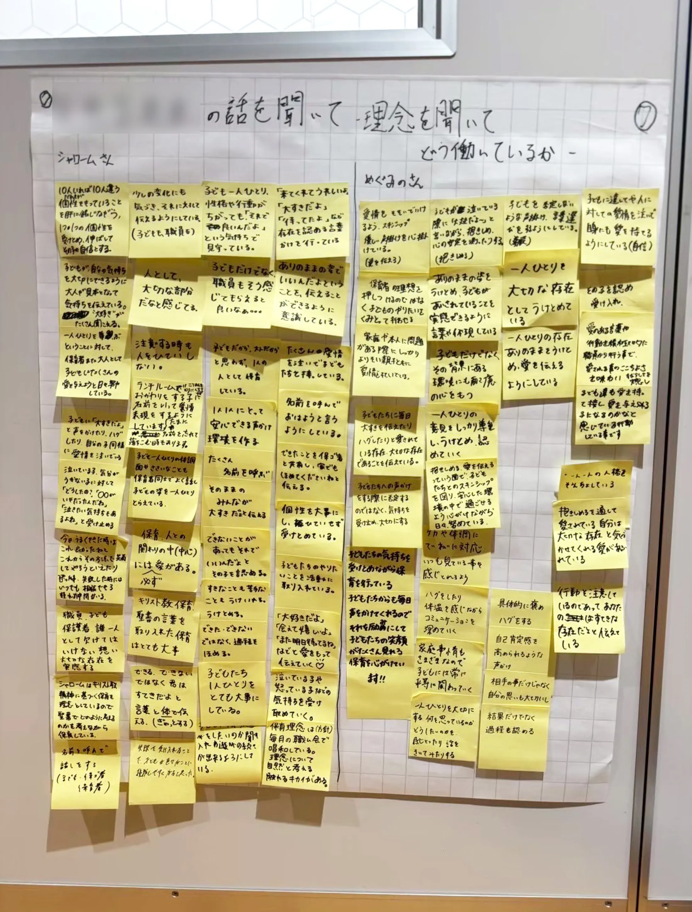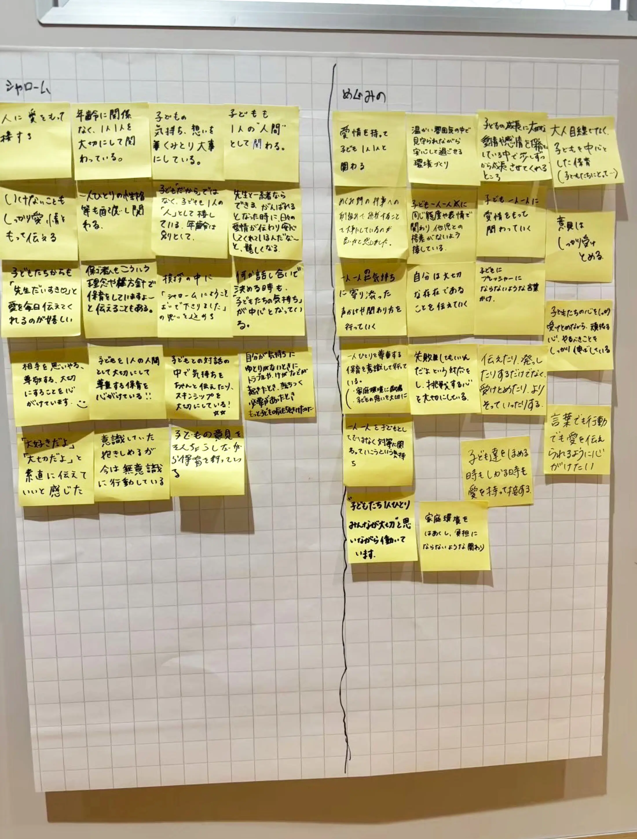 日々の保育を振り返ることで、理念が「風土として受け継がれている」ことをワークによって可視化、言語化していきます。