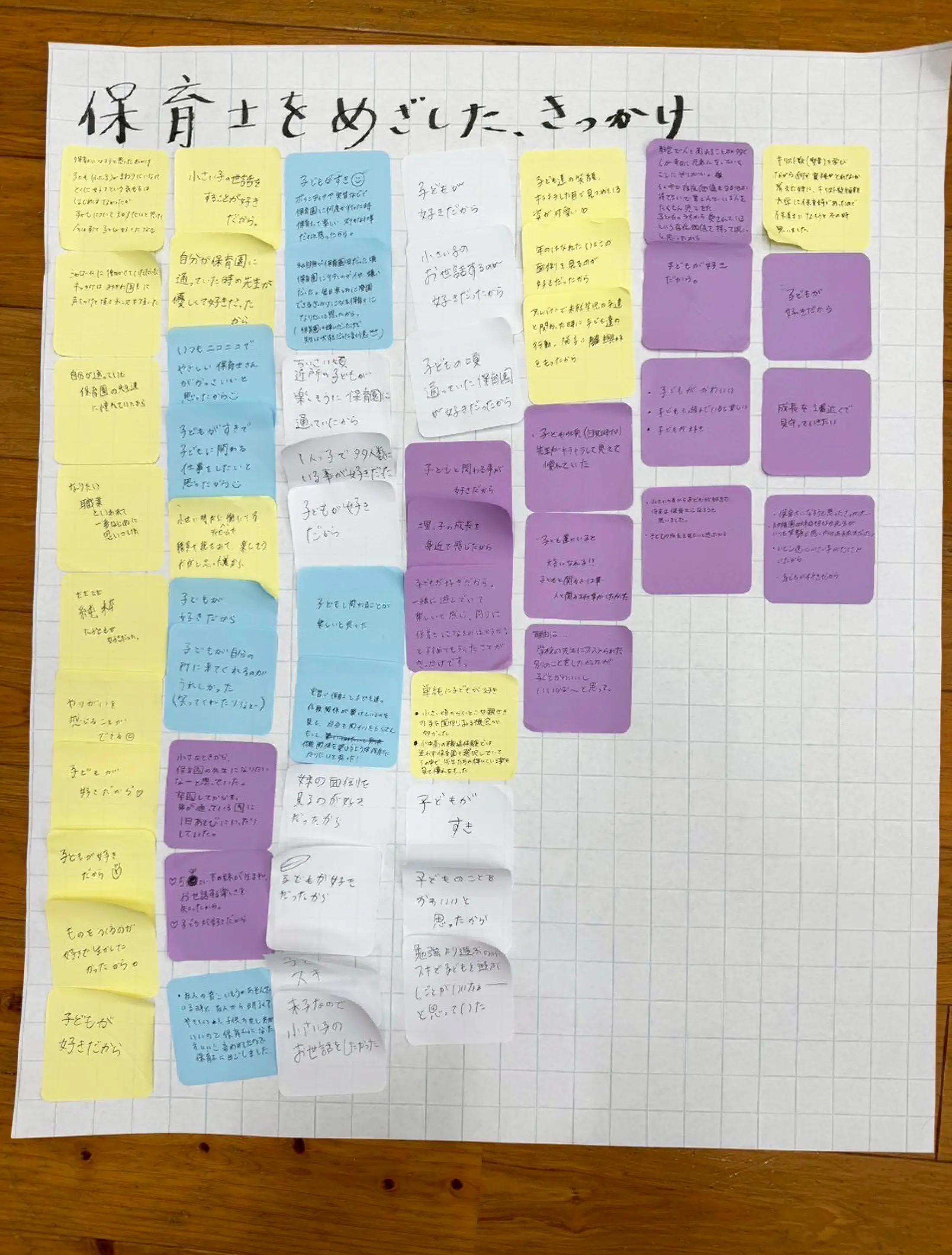 日々の仕事の中で忘れかけていた、保育士を目指した原点をワークによって可視化。そのプロセスの中で、創業者が大切にしてきた保育理念と、自分がこの法人で働く理由とが自然に結びつき、この法人で働く意味と想いが重なった。